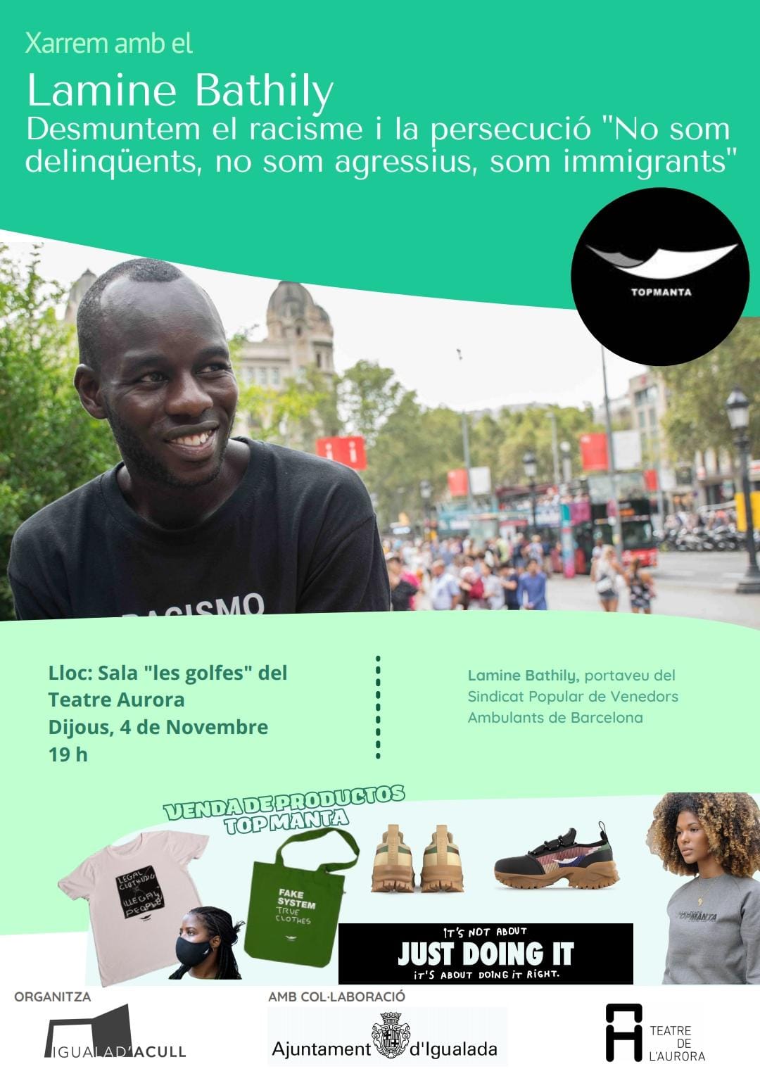 Dijous 4 de novembre a les 19 h el Teatre de l'Aurora acull l'acte organitzat per Igualad'Acull Desmuntem el racisme i la persecució “No som delinqüents, no som agressius, som inmigrants” una xerrada amb el Lamine Bathily, portaveu del Sindicat Popular de Venedors Ambulants de Barcelona.